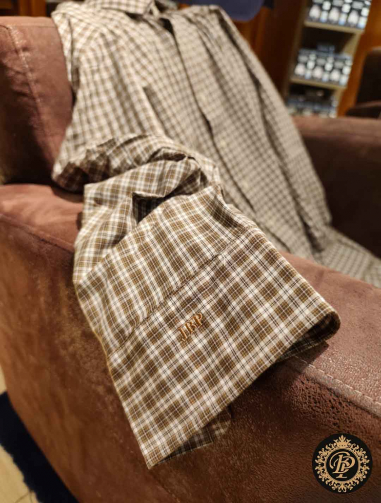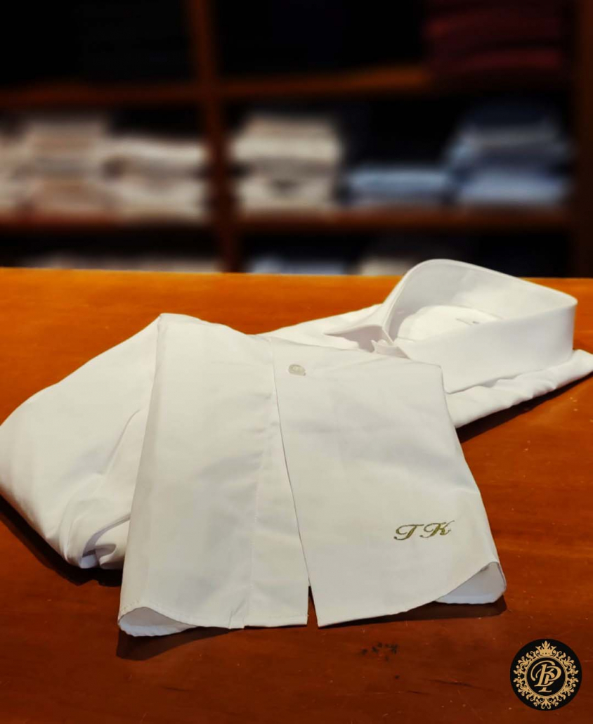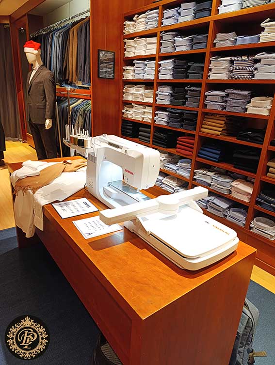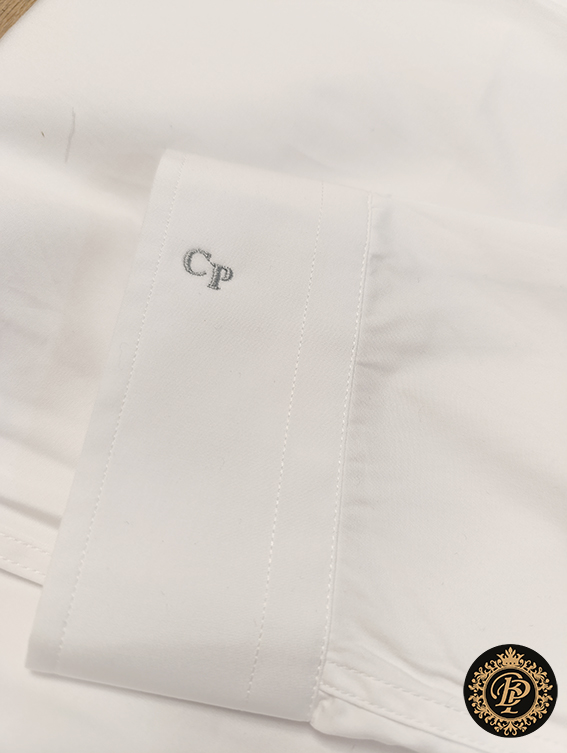 Initiales discrètes sur le poignet, signature élégante sur la poitrine ou marquage intérieur, chaque monogramme est réalisé sur place, avec un haut niveau de finition. La broderie machine permet une régularité parfaite, un fil net, une tenue irréprochable dans le temps. Rien n’est laissé au hasard.
